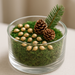 wypełnienie szklanego naczynia lub słoja z mchem, szyszkami i gałązką świerku,