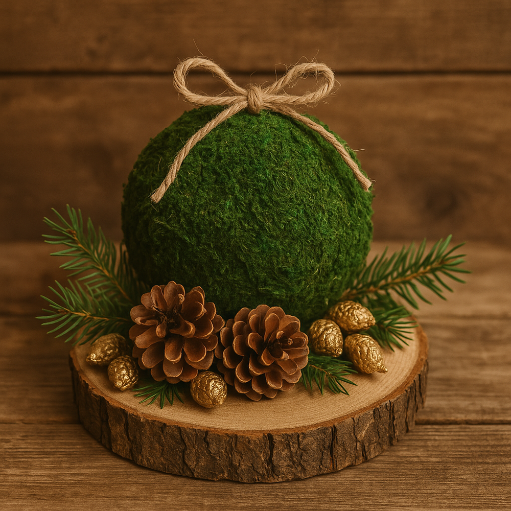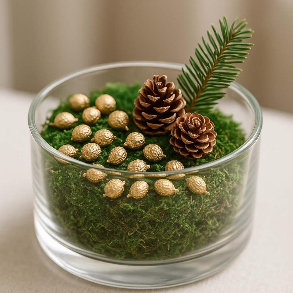 Złote Canella pięknie komponują się z zielonym mchem, naturalnymi szyszkami i gałązkami świerku – tworzą ciepły, rustykalny klimat.