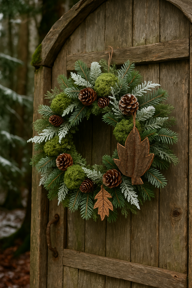Połączenie puszystego mchu, gęstego igliwia, szyszek oraz dekoracyjnych liści z naturalnej kory tworzy kompozycję o wyjątkowym, rustykalnym charakterze. Wianek idealnie podkreśli klimat zimowego lasu – zarówno na drzwiach, ścianie, jak i w roli dekoracji wewnętrznej.